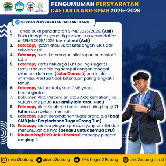 Pendaftaran ulang (daftar ulang) calon murid baru (CMB) SMA Negeri 2 Batang tahun ajaran 2025/2026 akan segera dilaksanakan. Calon murid yang dinyatakan diterima perlu melakukan daftar ulang dengan membawa persyaratan yang telah ditentukan. Informasi lebih lanjut mengenai jadwal dan persyaratan daftar ulang dapat dilihat di situs web atau media sosial SMA Negeri 2 Batang, serta situs resmi SPMB Jateng.